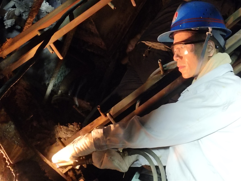 在4#連鑄機(jī)二冷室里,第堅(jiān)強(qiáng)正埋頭忙碌著,尾坯剛剛拉過二冷室,等不及溫度降下來,他拿著扳手、割槍,鉆進(jìn)狹小的二冷室里干活,噴淋管上不時(shí)有水滴落下,他在水滴與汗滴下與時(shí)間賽跑。從一流到八流,從一段到三段,“滋滋”的聲響伴隨著鋼花飛舞。這一進(jìn)去便是半小時(shí),等他出來后,全身的工作服都濕透了,汗水順著衣角流到了地上,而他全然不顧,又忙著去切冷鋼。