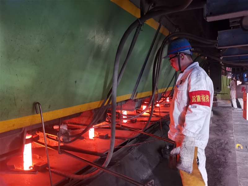 “快,四流紅坯未割斷…”推鋼工通過對(duì)講機(jī)著急地向臺(tái)下人員反饋信息。接到通知,臺(tái)下組長(zhǎng)陳成林戴上手套,一把抓起割槍,邁開步子沖向四流準(zhǔn)備手工切割,另一名拉矯剪切工一邊開乙炔,一邊托起氧帶緊跟其后。找準(zhǔn)位置站穩(wěn)后,其它幾個(gè)流的紅坯像是一條條火龍,從他們身旁穿梭而過。陳成林強(qiáng)忍著紅坯的炙烤、咬緊牙關(guān),左手半遮著臉,右手緊握割槍對(duì)準(zhǔn)切割位置,伴隨著切割的“滋滋”聲,紅坯一分為二,他們的臉龐被烤得紅彤彤的,白色的阻燃服也烤得有些發(fā)黃。顧不上喝一口水,他們又趕緊跑去處理火焰切割機(jī)故障。拉矯剪切工們不僅要保證鋼坯的順利出坯,而且每小時(shí)都要跨過頂著近百度的高溫測(cè)量一次定尺,保證鑄坯的定尺合格率達(dá)到100%。