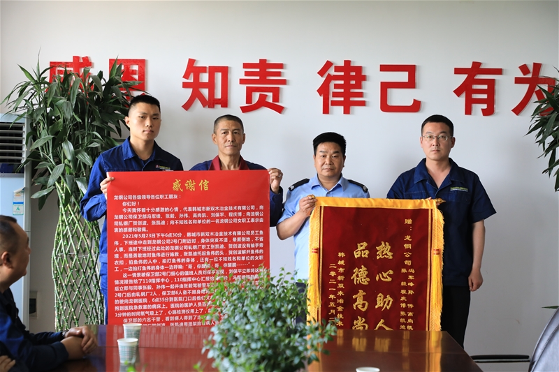 5月27日,同興公司協(xié)作單位韓城市新雙木冶金技術(shù)有限公司負責人,將一面寫有“熱心助人 品德高尚”的錦旗以及一封感謝信送到公司,對公司軋鋼廠職工賀創(chuàng)波等三人和保衛(wèi)部職工馮軍鋒等六人表示感謝,感謝他們在關(guān)鍵時刻見義勇為,對外協(xié)單位職工魚偉施以援手的救命之恩和感激之情。