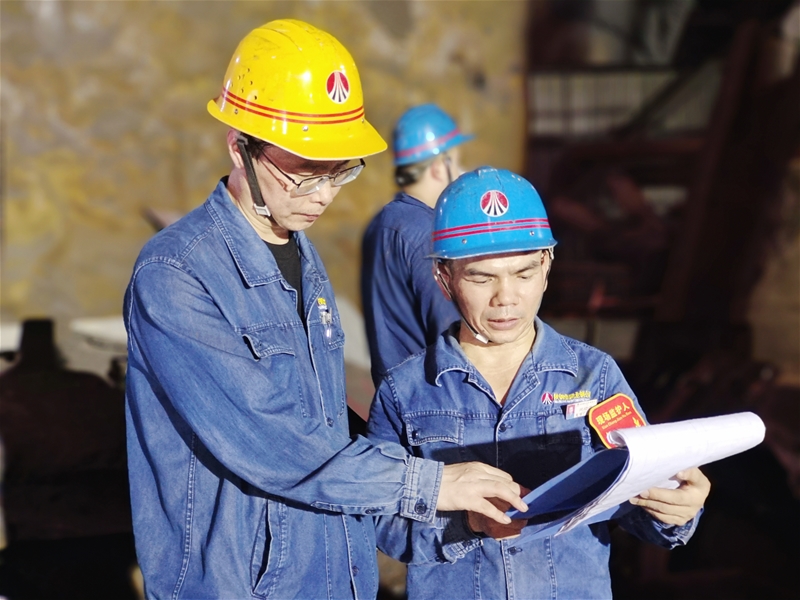 針對生產(chǎn)過程中鐵水罐結(jié)蓋嚴(yán)重這一情況,混鐵爐工指揮天車進(jìn)行鐵錐壓蓋操作,一次鐵錐壓蓋雖然只有短短的幾分鐘,但必須“一快二穩(wěn)三準(zhǔn)”,并且不能影響轉(zhuǎn)爐兌鐵,絲毫不能有差錯;扈F爐工沒有任何抱怨和懈怠,他們一絲不茍地作業(yè),作業(yè)過程艱難而有序。雖然時值秋季,爐臺上依舊火熱,一個班下來,他們的工服始終是濕的,背上沾滿了鐵屑,汗水像斷了線的珠子,順著臉頰滾落。而他們顧不上這些,只緊緊盯著每一罐鐵水,克難攻堅,與時間賽跑、與炙熱戰(zhàn)斗,確保高質(zhì)量完成保供任務(wù)。