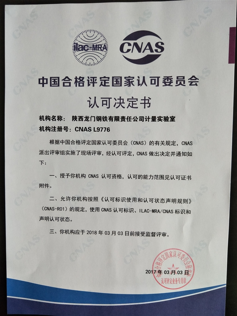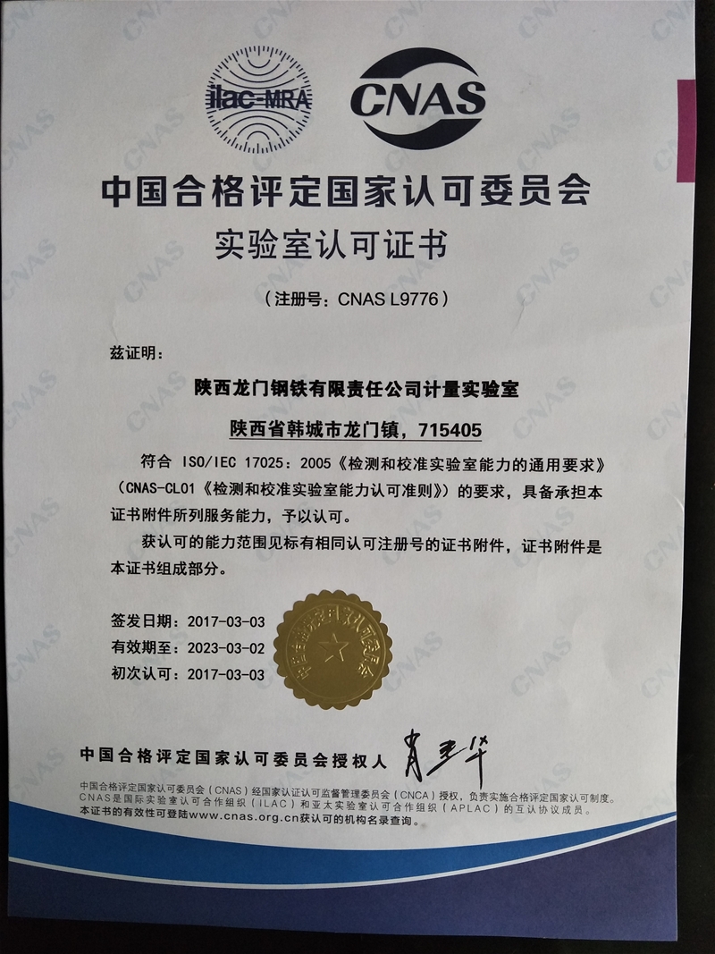 陜西龍門鋼鐵有限責(zé)任公司計(jì)量實(shí)驗(yàn)室具有25年測量設(shè)備校檢歷史,具有公司力學(xué)、熱工、長度、電磁、理化五大類18項(xiàng)最高計(jì)量標(biāo)準(zhǔn), 208臺(套)計(jì)量標(biāo)準(zhǔn)器具,實(shí)驗(yàn)室具有獨(dú)立校檢面積360平方米,下設(shè)熱工檢定室、壓力檢定室、高溫檢定室、長度檢定室、容器檢定室、電磁檢定室、氣體檢定室、質(zhì)量檢定室等多個專業(yè)檢定室,具有年校檢測量儀器設(shè)備2萬臺的能力.