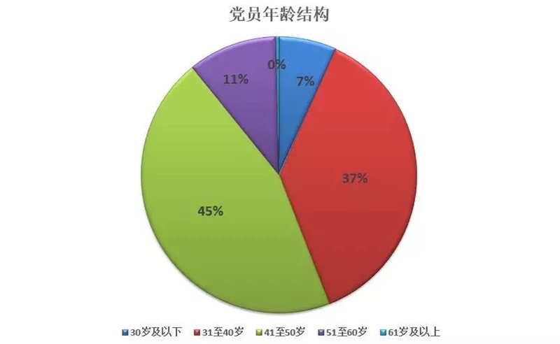 30歲及以下黨員72名,31至40歲黨員400名,41至50歲黨員483名,51至60歲黨員112名,61歲及以上黨員4名。