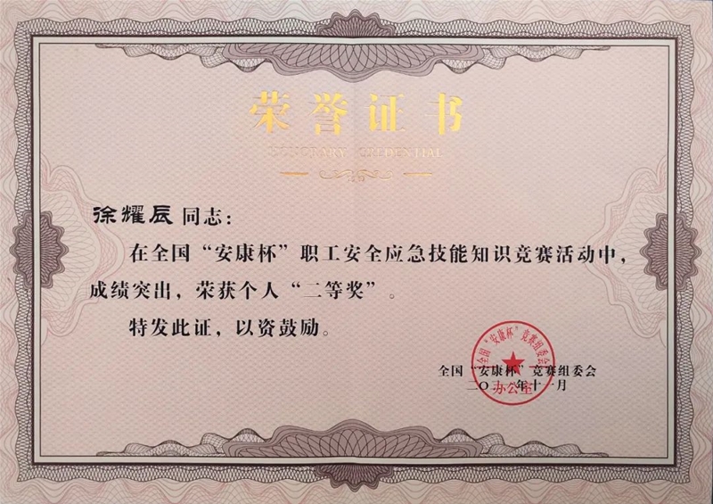 近日,公司喜獲全國“安康杯”職工安全應(yīng)急技能知識(shí)競賽活動(dòng)“優(yōu)秀組織單位”榮譽(yù)稱號(hào)。公司職工徐耀辰榮獲二等獎(jiǎng)。