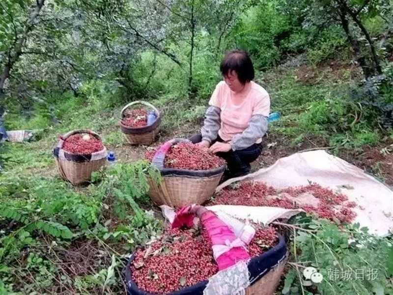 中午的太陽越發(fā)的熱,悶熱的空氣熱得摘椒人直冒汗,麻辣的花椒汁液滲進(jìn)皮膚,花椒刺劃破的地方火辣辣地疼。我漸漸敗下陣來,蹲在地隴旁邊休息。看著那些來自四面八方,說著不同口音的花椒客邊說邊笑,手下麻利地采摘,想想她們可真堅強(qiáng)。二嫂頭發(fā)上裹著一條濕毛巾,手指上下翻飛,一會探出上半身夠樹上邊的枝條,一會彎腰,劈開花椒樹下邊細(xì)碎繁密的毛刺,順便還用鐮刀修剪一下那些樹干上冒出的嫩芽。聽二嫂說:八月份,是家鄉(xiāng)豐收的季節(jié),這兩個月要手腳麻利,不能讓花椒熟過了,落地上了可惜。今年雨水好,花椒結(jié)的果多,三斤半濕花椒就能曬成一斤干花椒,花椒價格比過去翻了幾番,孩子們上學(xué)的學(xué)費(fèi),家里的開支全靠著花椒。原來,在家鄉(xiāng)村民心中,花椒就是他們的衣食父母,只要勤勞就能致富。