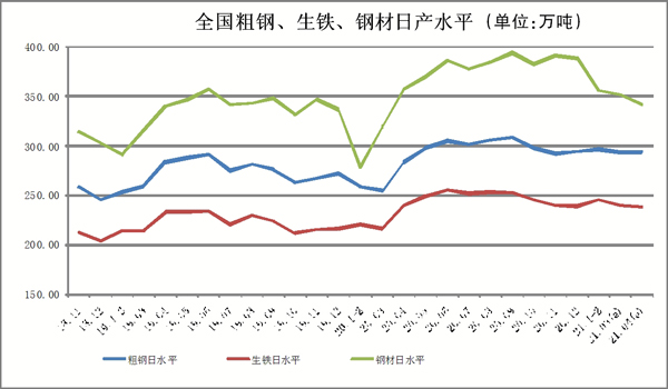 根據(jù)重點(diǎn)統(tǒng)計(jì)鋼鐵企業(yè)產(chǎn)量估算,本旬全國(guó)共生產(chǎn)粗鋼2933.68萬(wàn)噸,日產(chǎn)粗鋼293.37萬(wàn)噸、環(huán)比增長(zhǎng)1.14%、同比增長(zhǎng)12.60%;生產(chǎn)生鐵2386.64萬(wàn)噸,日產(chǎn)生鐵238.66萬(wàn)噸、環(huán)比增長(zhǎng)0.70%、同比增長(zhǎng)8.10%;生產(chǎn)鋼材3422.50萬(wàn)噸,日產(chǎn)鋼材342.25萬(wàn)噸、環(huán)比下降0.83%、同比增長(zhǎng)12.73%。本月累計(jì)平均日產(chǎn),全國(guó)粗鋼環(huán)比下降0.05%、同比增長(zhǎng)12.60%,生鐵環(huán)比下降0.36%、同比增長(zhǎng)8.10%,鋼材環(huán)比下降2.58%、同比增長(zhǎng)12.73%。
