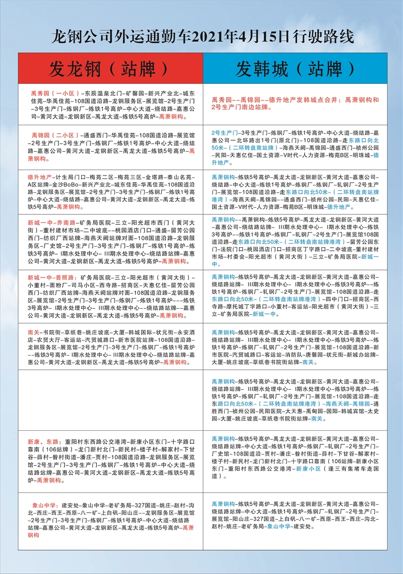 龍鋼公司外運(yùn)通勤車時(shí)間表2021年4月15日