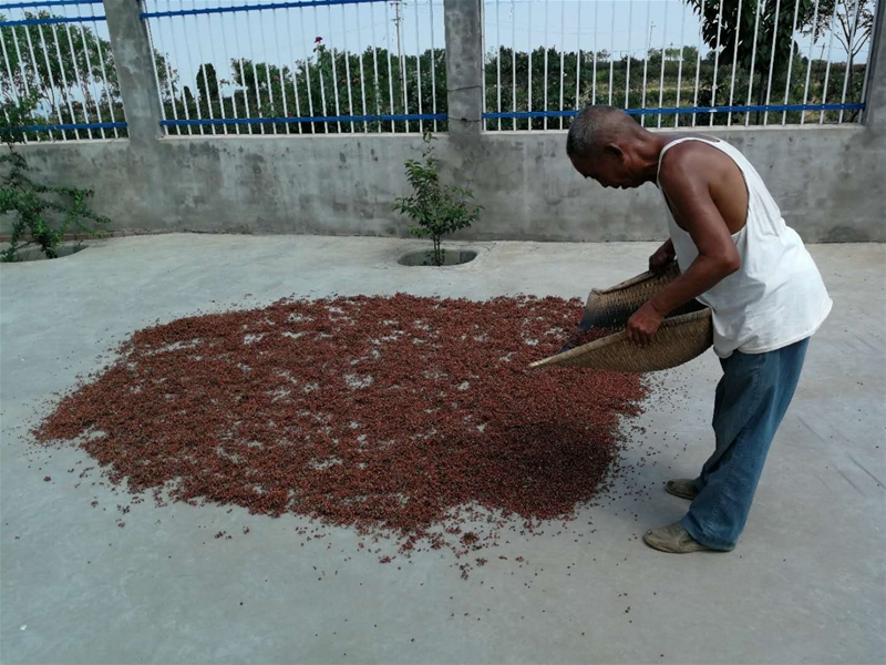 中午吃飯的時(shí)候,爺爺就不見(jiàn)了,只聽(tīng)見(jiàn)院子里“嚓嚓嚓”的聲音,隨即我來(lái)到院子里看見(jiàn)爺爺在收花椒,摸了摸花椒還沒(méi)干就問(wèn)爺爺:“爺爺,花椒還沒(méi)曬干怎么就收了。”爺爺說(shuō)道:“這曬花椒不能曬的太干了,太干了花椒就碎了,不好脫籽”說(shuō)著爺爺已經(jīng)將花椒掃成一堆,用木扒將花椒輕輕地拍打,使花椒籽從花椒上脫離出來(lái),隨后將大部分花椒用木扒扒出來(lái)晾曬,剩下的花椒和籽混在一起不好分離,這時(shí)候爺爺就用簸箕將花椒和籽用他的多年技術(shù)給分離出來(lái)?粗鵂敔敻傻暮貌粺狒[我也試著干了一會(huì),發(fā)現(xiàn)花椒粒沒(méi)有從花椒籽里分出來(lái),它們還是混在一起,看來(lái)這個(gè)活還得慢慢積累經(jīng)驗(yàn)。